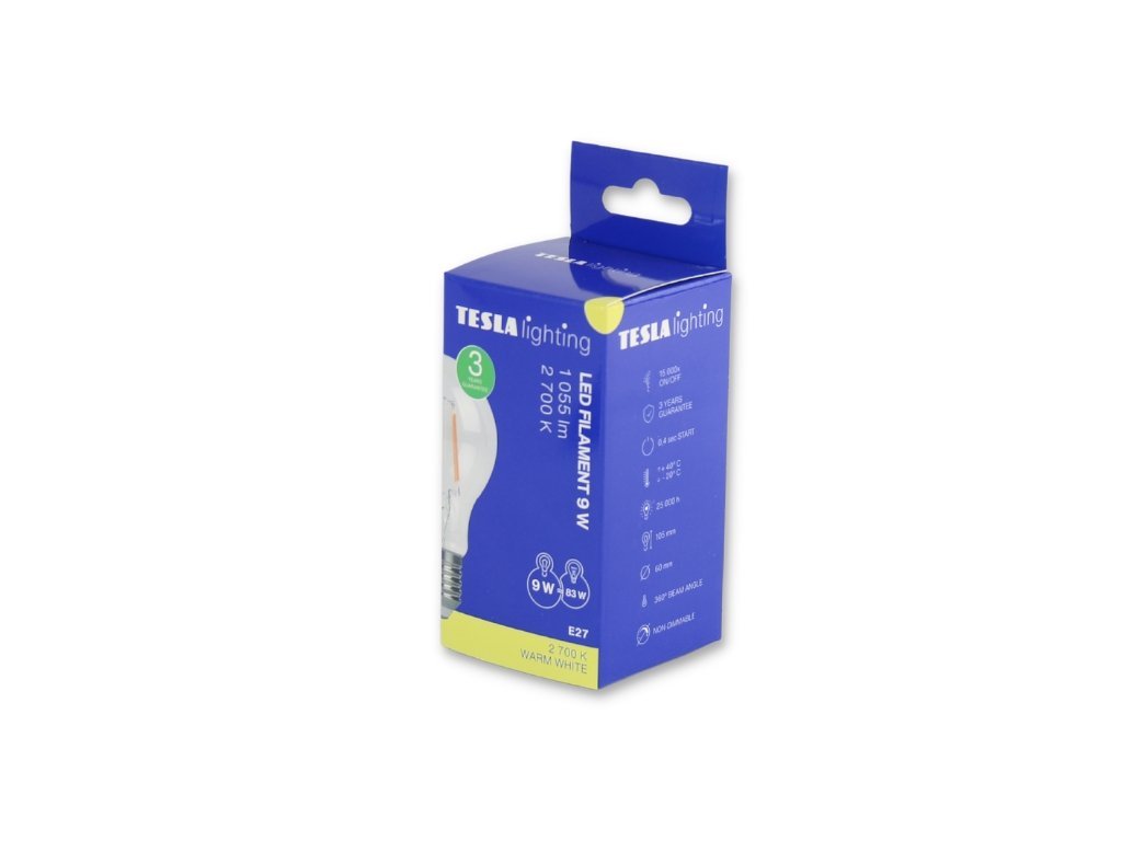 LED žárovka Tesla s nízkou spotřebou řady Filament Retro. Patice: E27 Napětí: 230V Příkon: 9W Náhrada klasické žárovky: 75W Světelný tok: 1055lm Vyzařovací úhel: 360° Barva světla: teplá bílá (2700K) Životnost: 25 000hod. Počet spínacích cyklů: 15 000 CRI (index podání barev): ≥80 Okamžitý start Stmínatelná: NE Provozní teplota: -20°C - +40°C Rozměry: průměr 60x105mm Třída energetické účinnosti: EDoplňkové parametry