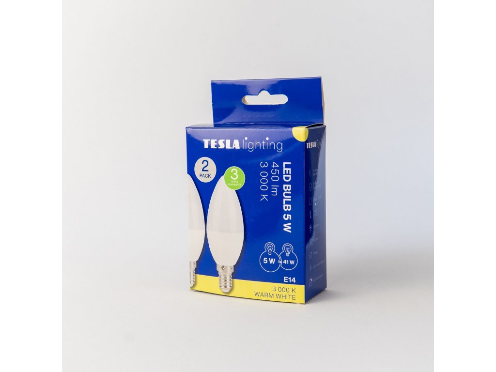 LED žárovka Tesla CANDLE svíčka, E14, 5W, 230V, 450lm, 25 000h, 3000K teplá bílá, 220st 2ks