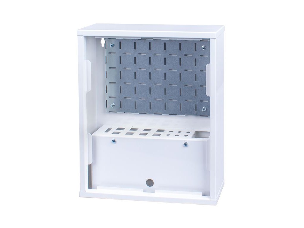 Lexi-Net Basic univerzální skříň 300 x 300 x 140 mm, bílá Běžně dodávaný v rozloženém stavu Hloubka 90 mm Barva bílá RAL 9003 Materiál ocel 1mm s práškovým nástřikem Váha 4 kg Váha včetně balení 4,15 kg plechové dveře s perforací Rozměr balení 427 x 345 x 97 mm Venkovní rozměr rozvaděče 420 x 340 x 90 mm Krytí IP20 Možnost osazení: keystone RJ45 - 8ks, "F" konektor - 6pcs, SC DUPLEX konektor - 1ks el. zásuvka 230VDoplňkové parametry