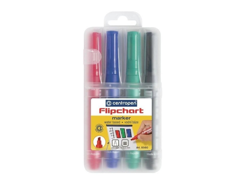 určen pro psaní na papír, zejména na papírové tabule Flip-Chart vysoká odolnost proti zasychání inkoustu v hrotu otevřený vydrží 1 týden inkoust na vodní bázi se nepropíjí papírem bez zápachu klínový hrot šířka stopy 1 - 4,6 mm sada 4 barevDoplňkové parametry