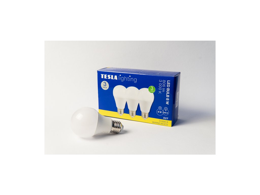 Tesla - LED žárovka BULB E27, 8W, 230V, 806lm, 25 000h, 3000K teplá bílá, 220st 3ks v balení
