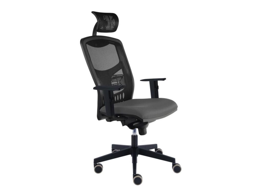 moderní kancelářská židle s vysokým fixním síťovaným opěrákem výškově stavitelná bederní opěrka čalouněný sedák podhlavník síťovaný, výškově a úhlově stavitelný výškově stavitelné područky, plastový top kříž z černého nylonu kolečka Ø 50 mm, guma (na tvrdé podlahy) mechanika SYNCHRO umožňuje ergonomické, závislé naklápění sedáku a opěráku (úhel sedáku v rozmezí 1-9°, úhel opěráku v rozmezí 90-111°) zajištění mechaniky v 5 polohách možnost nastavení tuhosti houpání v závislosti na hmotnosti uživatele centrálním šroubem pod sedákem antišokový systém zabraňující samovolnému navrácení opěráku při odjištění funkce naklápění nosnost 130 kg barva šedáDoplňkové parametry